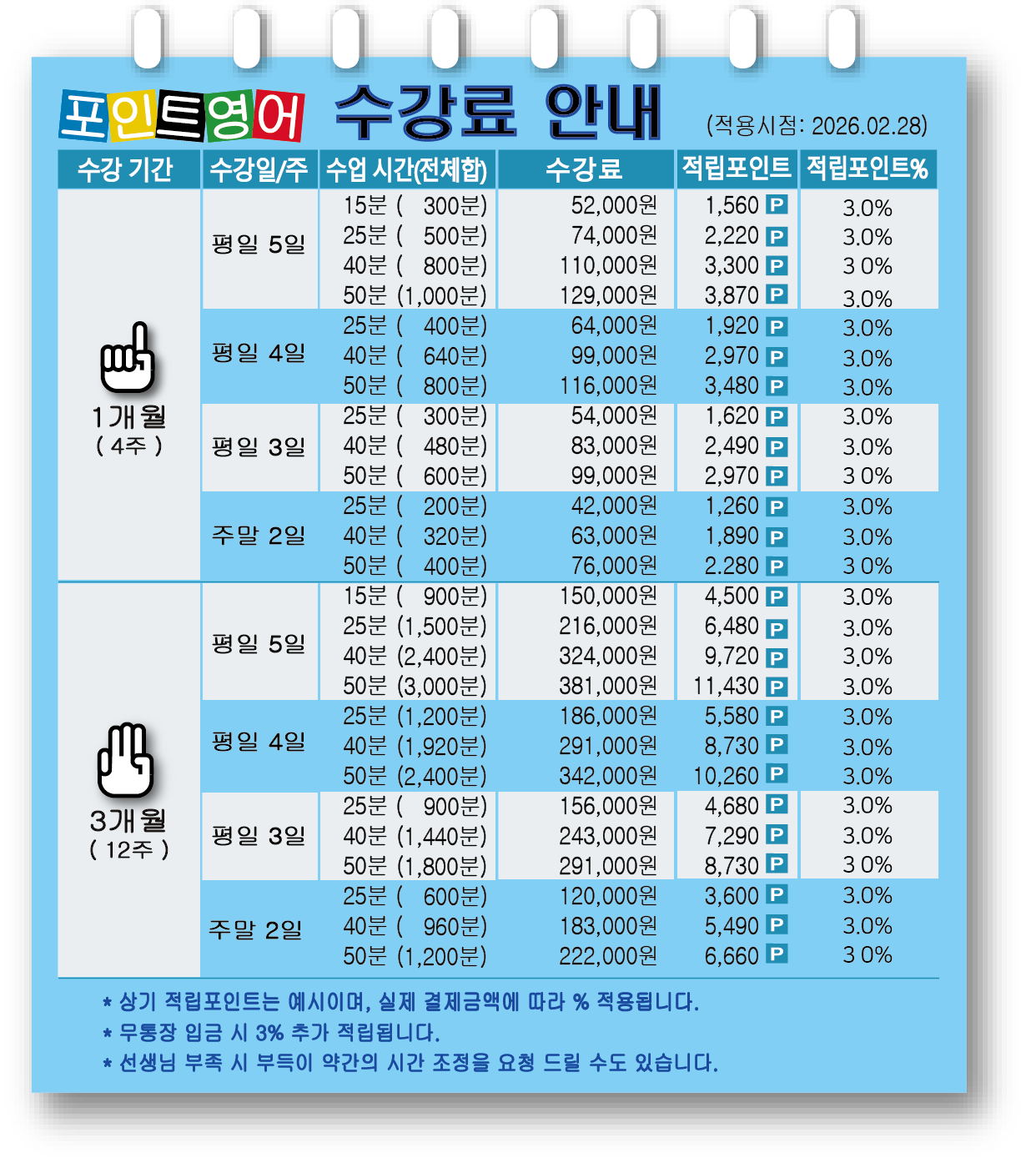 변경 내역: 4주 평일 5일 15분 4주 수업 수강료 2,000원 인상 / 12주 평일 5일 15분 수업 수강료 6,000원 인상